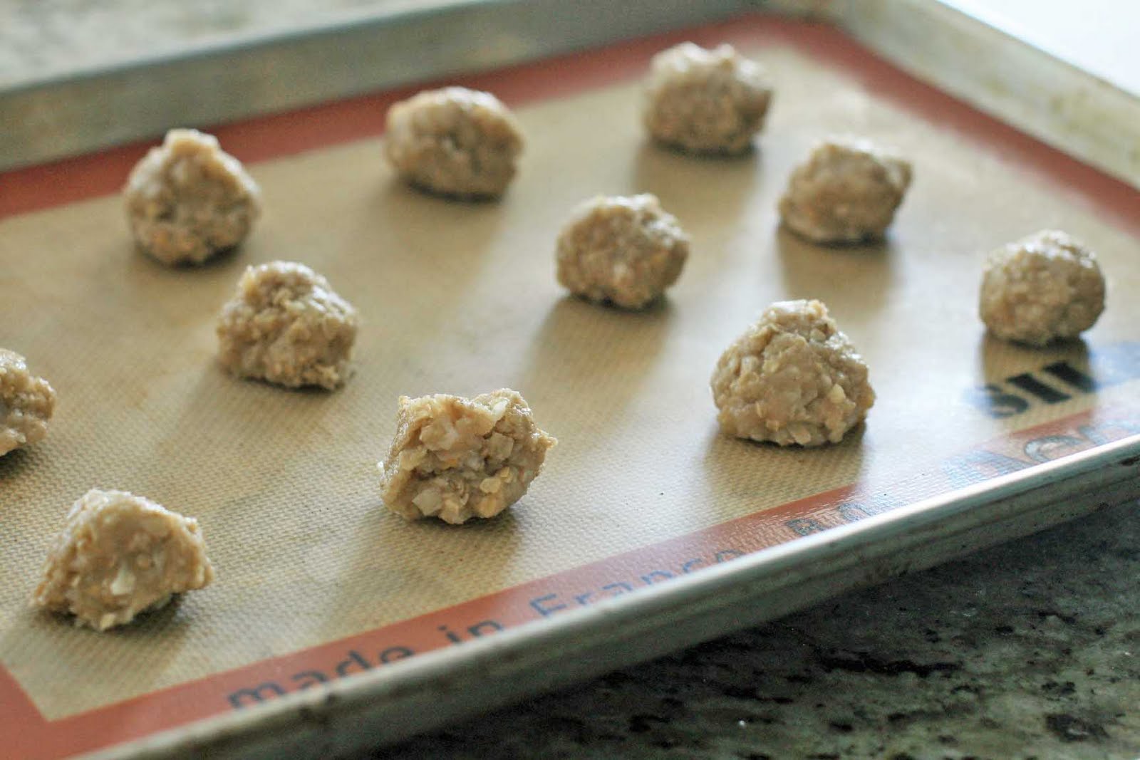 Preheat the oven to 350 degrees and grease a baking sheet or line with a Silpat baking mat.
