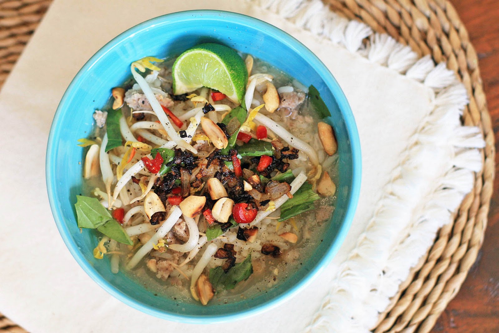 Ladle some of the rice and pork soup into individual bowls. Top with herbs, some bean sprouts, some chopped scallions, the crispy shallots, freshly ground pepper and some chopped peanuts.