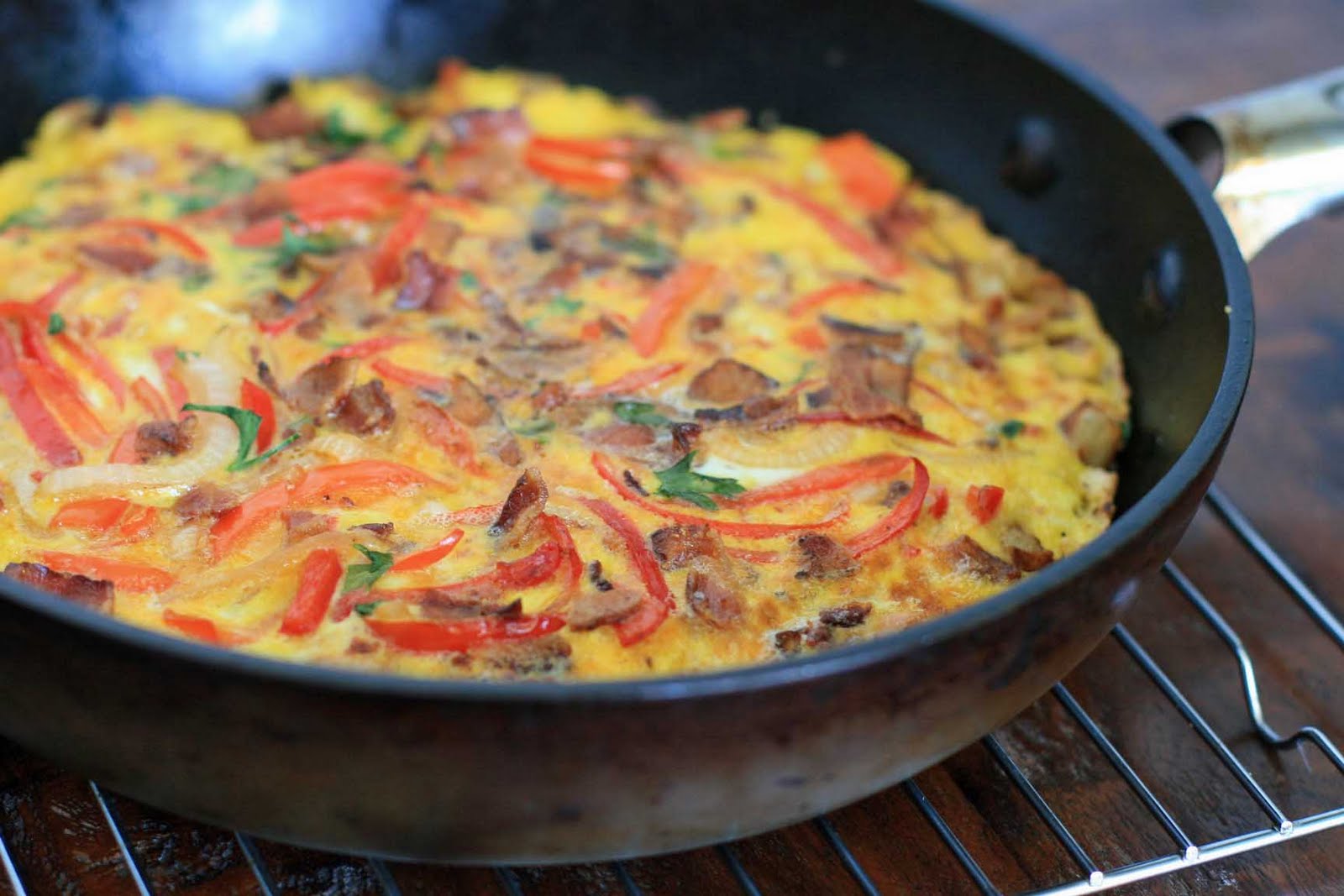 Preheat the broiler. Evenly distribute the potatoes around the skillet, adding extra oil, if necessary, to coat the skillet. Add the eggs and peppers and cook without stirring until the bottom begins to brown, about three minutes. Cover and cook an additional three minutes… the top of the eggs may not be set at this point. Remove from heat and sprinkle the crumbled bacon across the surface. Place under the broiler for several minutes, until the top of the tortilla is set and is beginning to brown. Remove from under broiler and sprinkle with parsley.