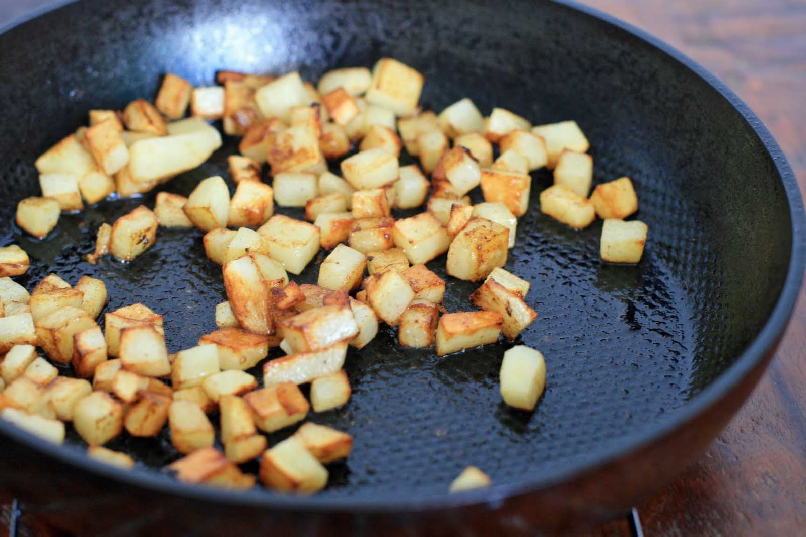 Heat 2 Tablespoons oil in a large ovenproof skillet over medium-high heat. Add the red pepper strips and onion and sauté until tender. Remove and set aside. Add the remaining 2 Tablespoons of oil and the potato cubes and cook until browned and crispy.