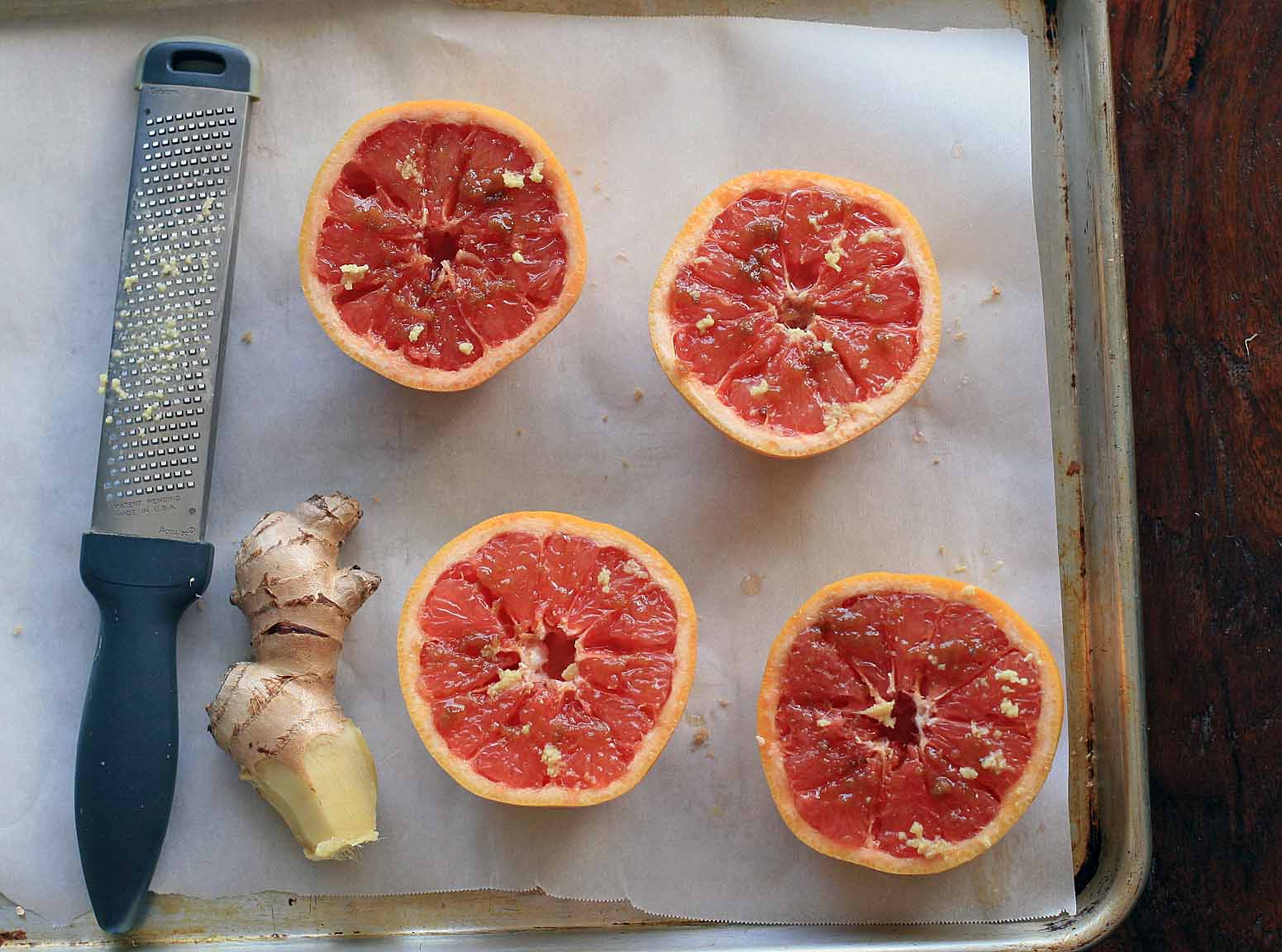 Place the grapefruit halves on the parchment paper and sprinkle with brown sugar. Use a Microplane zester to grate the ginger on top of the grapefruits.