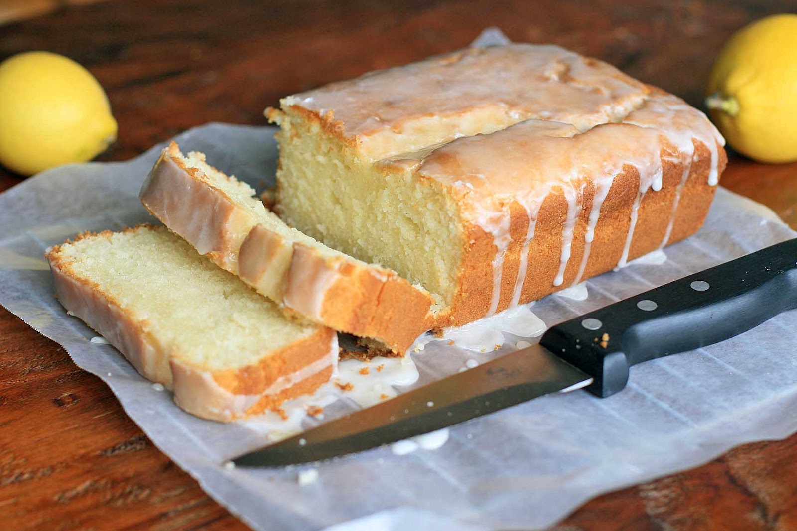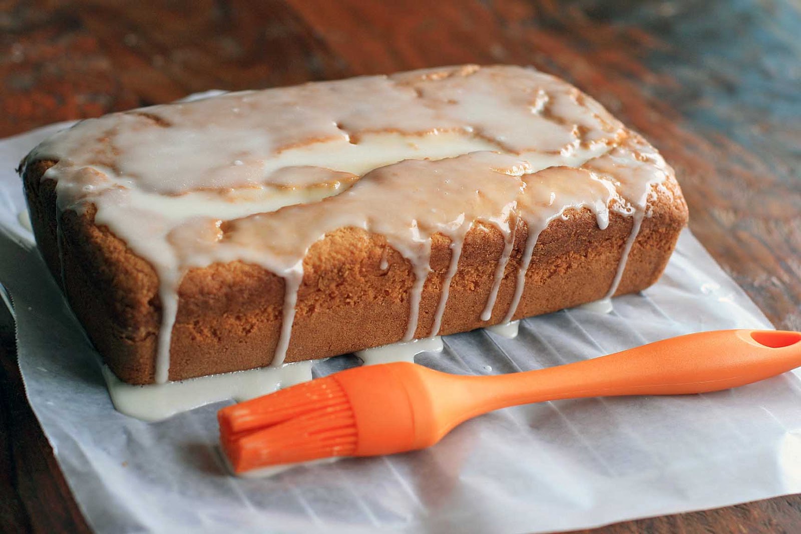 Prepare the glaze by whisking together the Meyer lemon juice and the powdered sugar. Place the loaf on a piece of wax paper and drizzle or brush the glaze over the top, allowing the glaze to drip down the sides.