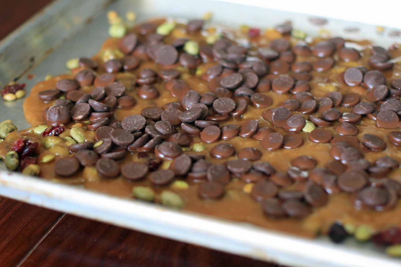 This time I lucked out at the store and they had a mix of edamame with cranberries, almonds and sunflower seeds; the combo makes the toffee look so pretty. If you can’t find a similar mix, you can always make your own according to your own preferences.