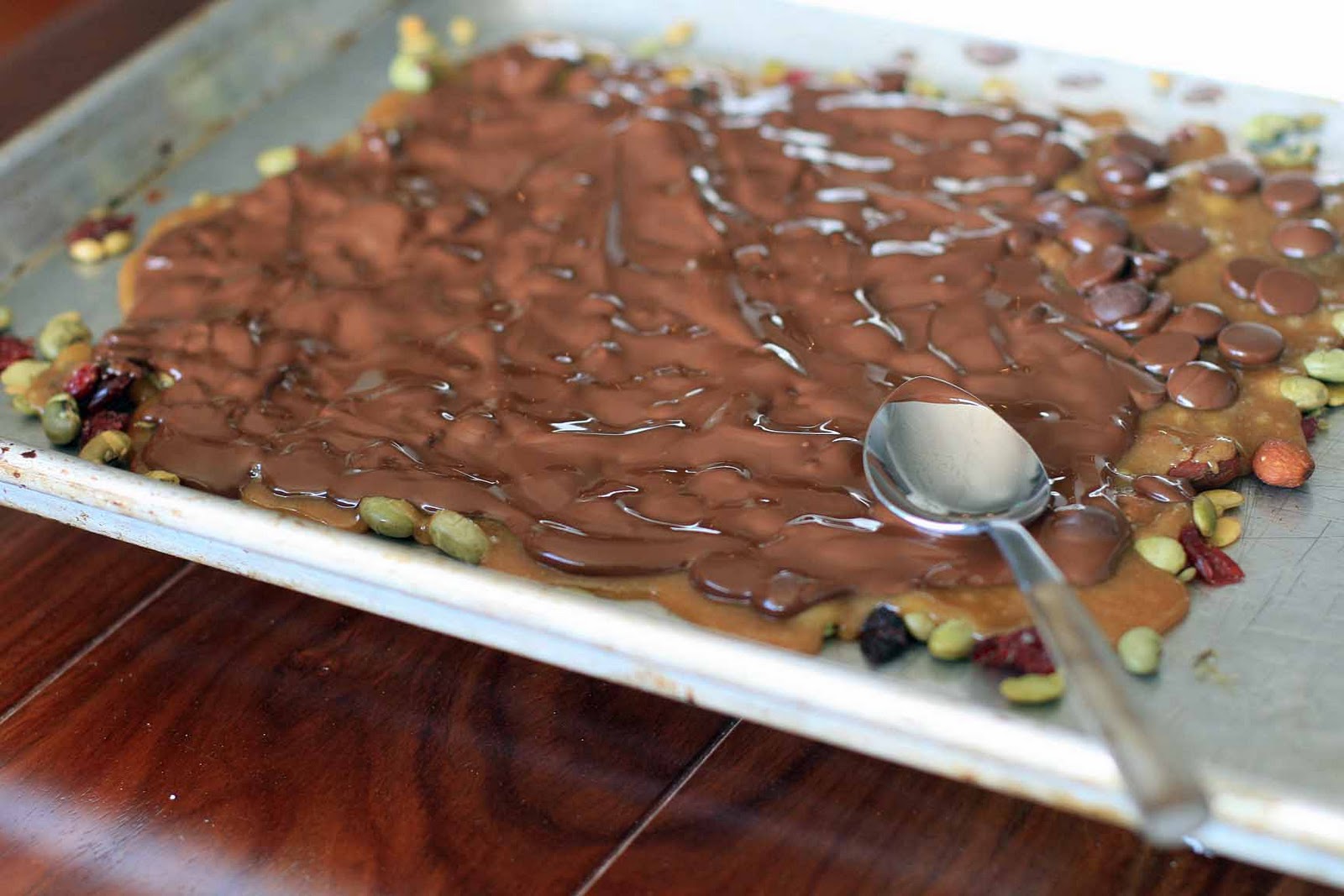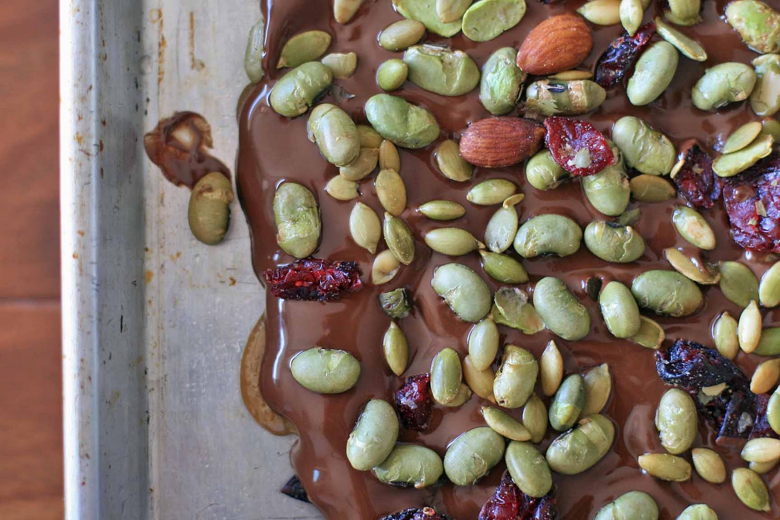 Sprinkle the chocolate chips evenly over the top and let stand 2 minutes, then use a spatula or the back of a spoon to spread in an even layer. Sprinkle the remaining edamame over the chocolate and gently press them in with your hands.