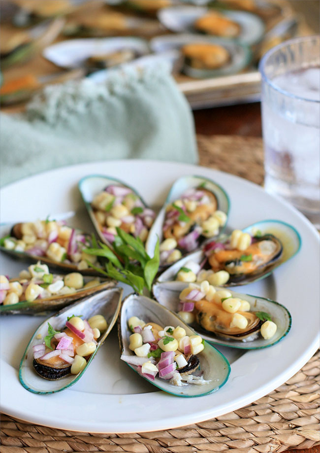 Mussel lovers, meet your new favorite party appetizer. I’m not even that much of a mussel fan, but when I saw photos of this pretty Peruvian dish, I knew I had to make it. Mussels get topped with a fresh and simple corn salsa and served on the half shell. They’re simple, taste great and are one heck of an attractive dish, if I do say so myself.