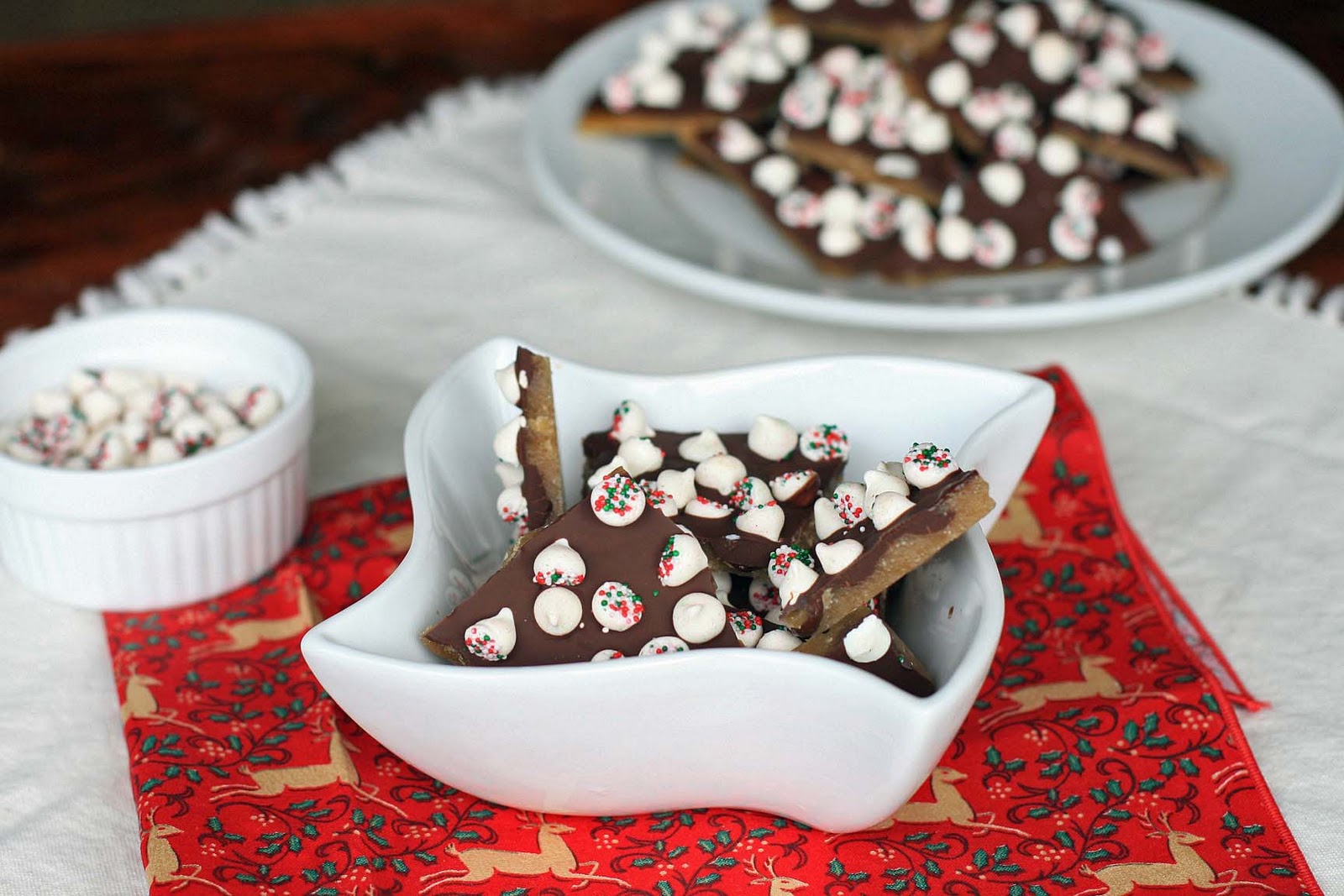 Just like their name implies, the chips are nice and smooth with a delicate mint taste. And since they’re so pretty, I wanted to use them in a recipe where they got to show off their good looks. I settled on a chocolate covered toffee with the mint chips sprinkled on top.