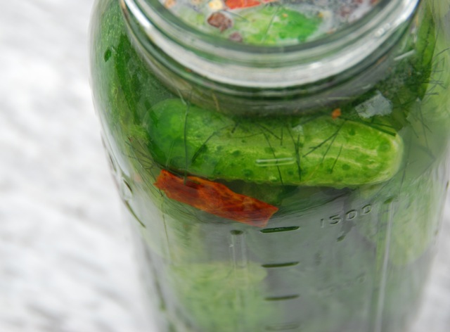 2. Fill jar with cukes. Pack them in, but not so tightly that they can’t move at all.