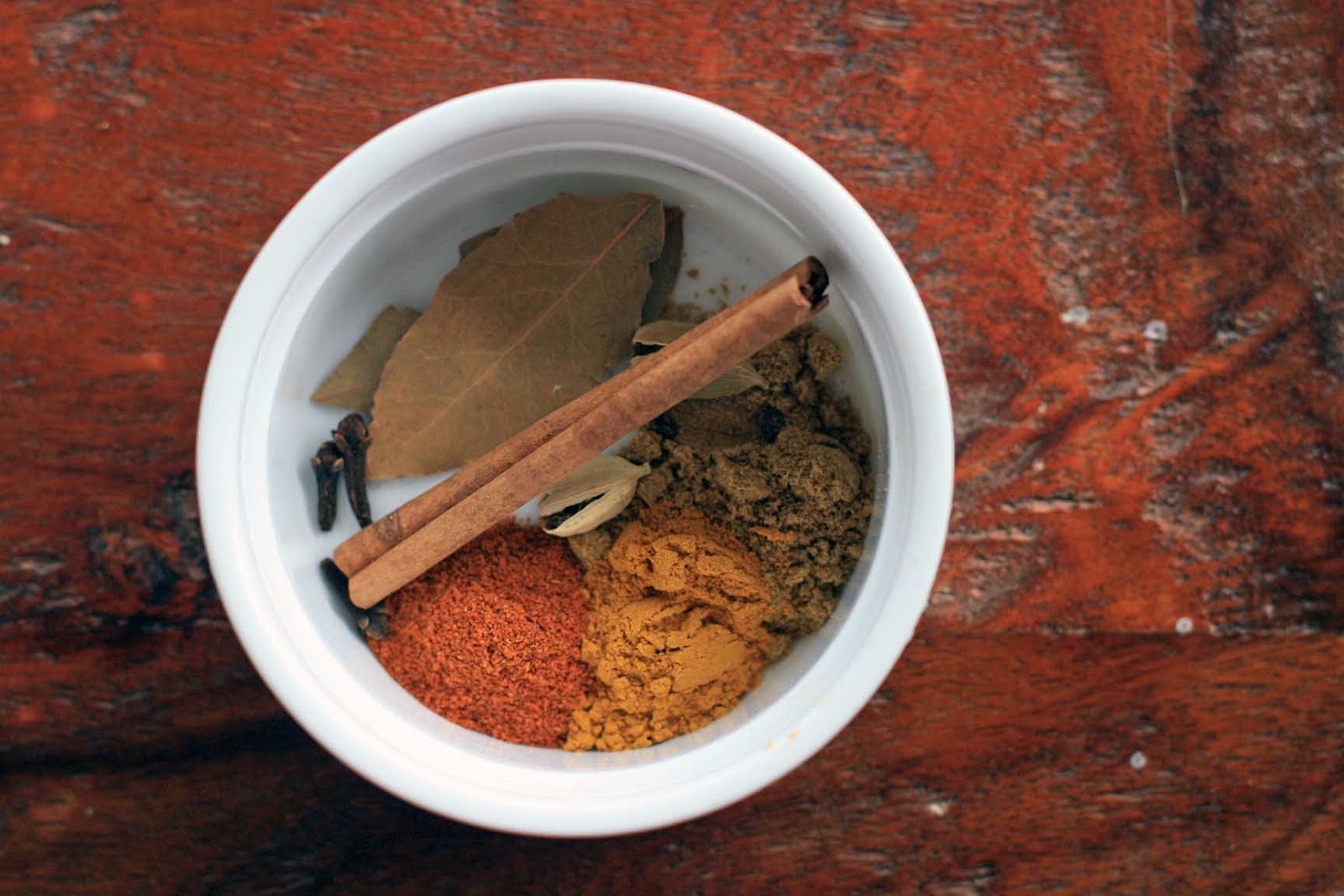 Heat the oil in a large skillet over medium-high heat. Add the cinnamon, bay leaves, cumin, turmeric, cayenne, cloves, and cardamom and cook, stirring, until very fragrant, about a minute or two. Next, add the onion, garlic, and ginger and cook until golden. Add the spinach and cook until just wilted along with the salt.