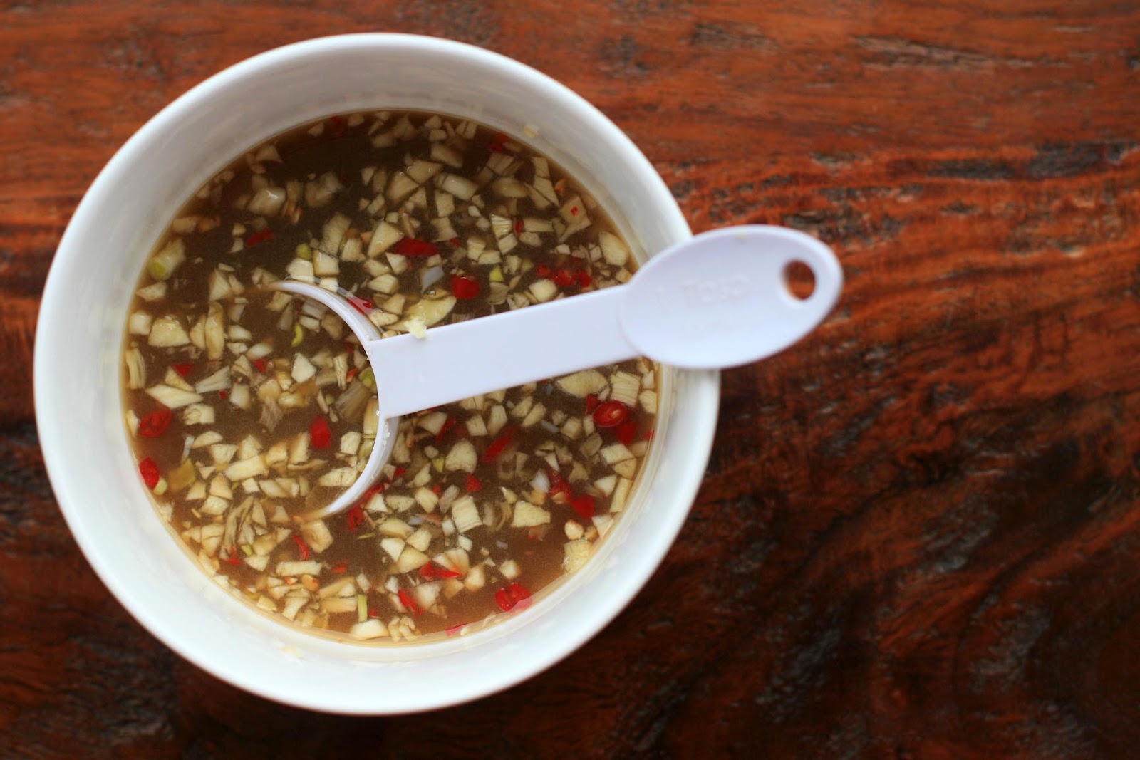 In a small bowl combine the fish sauce, lime juice, garlic, sugar and chile. Stir well and set aside.