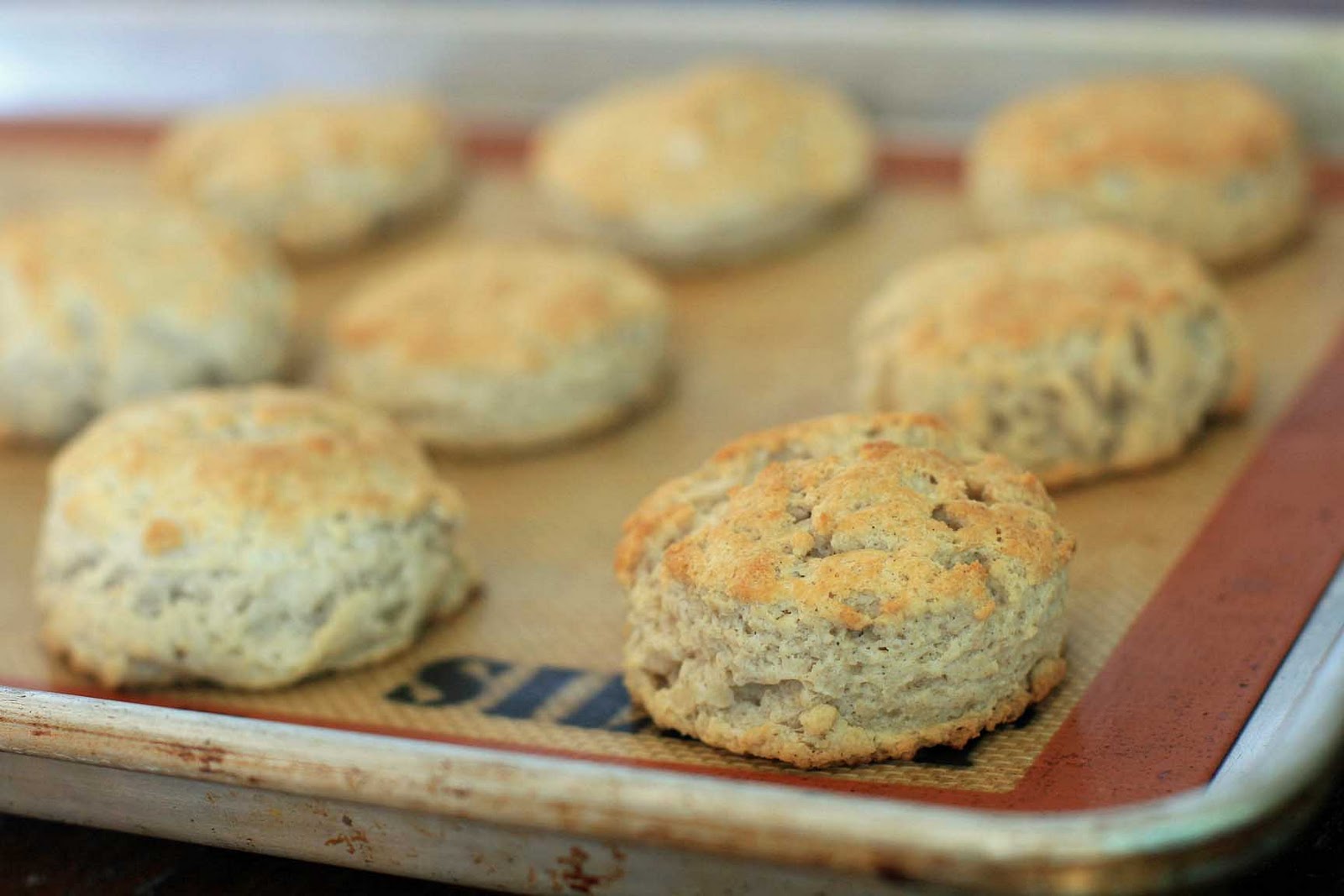 Remove the dough from the refrigerator and between the sheets of plastic, roll out the dough to a thickness of about an inch to an inch and a half, depending on how large you’d like your biscuits. Peel back the top layer of plastic and cut out rounds of dough using a floured 2 1/2-inch biscuit cutter (or a floured can or glass about the same approximate diameter). Place dough on the prepared baking sheet. Re-roll any leftover dough and again cut out rounds of dough. Use your hands to shape any small, left-over dough.