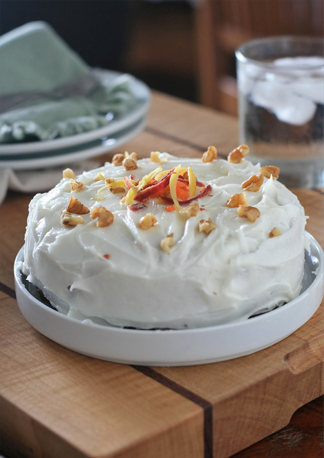 Although I normally eat this particular cake plain, I smeared on a heavy layer of sour cream frosting to even out the top and gussied it up with a couple chopped walnuts and some shavings from some of the multi-colored heirloom carrots. I couldn’t quite catch myself from offering a quick apology for the less than brilliant appearance, but I shouldn’t have bothered: everybody loved it.