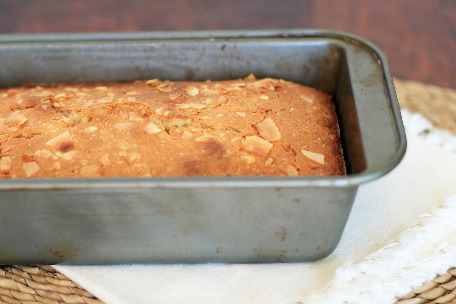Add the rice flour, sorghum flour, tapioca starch, xanthan gum, and salt and blend well until totally combined and the mixture begins to become elastic. Mix in the dried coconut. Pour into the prepared loaf pan and smooth the top. Tap the pan on the counter to help break up any air bubbles that may have formed in the dough. Sprinkle the extra coconut over the top of the dough.