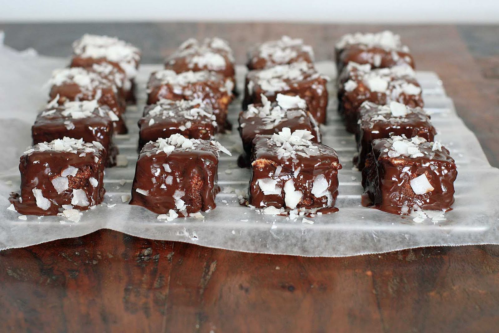 Take individual pieces of sponge cake and carefully drop into the chocolate ganache to coat all sides. Once coated, place on a cooling rack covered with wax paper and sprinkle with the coconut. If you’d like more coconut, roll the ganache-covered cake in the coconut to coat on all sides.