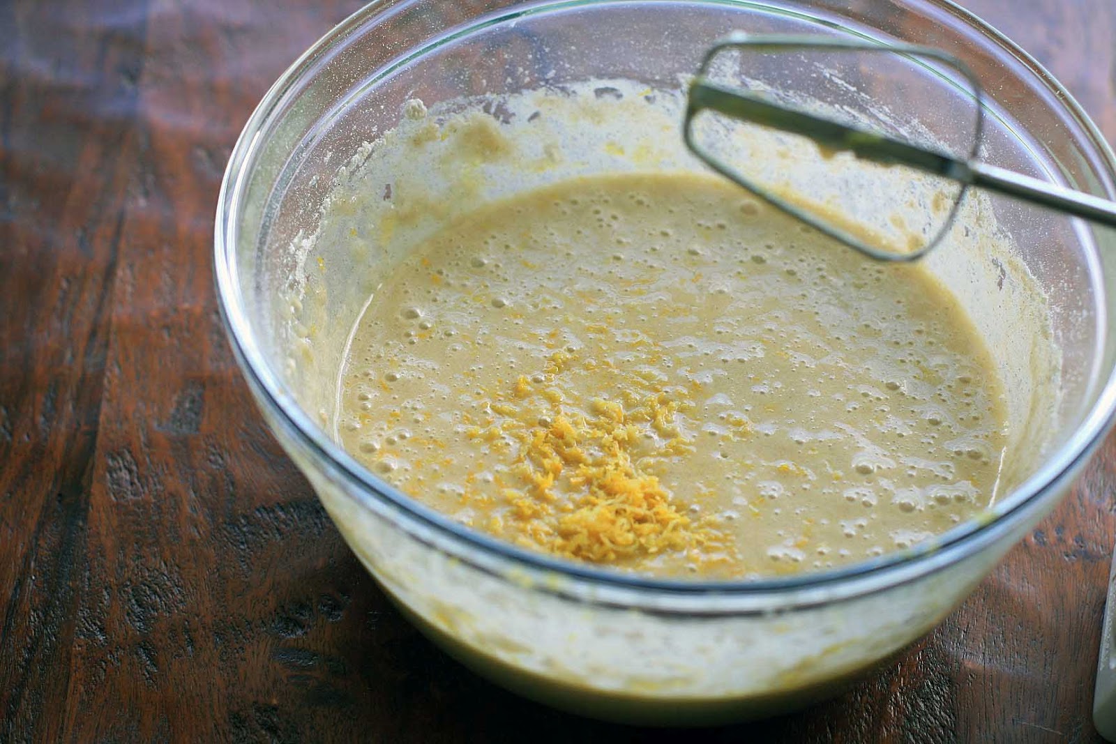 Beat the sugar and eggs together. Add the rice flour, potato starch, tapioca starch, salt, baking powder, xanthan gum, oil, milk, lemon extract and lemon rind. Beat for about a minute, making sure there are no pockets of dry ingredients.