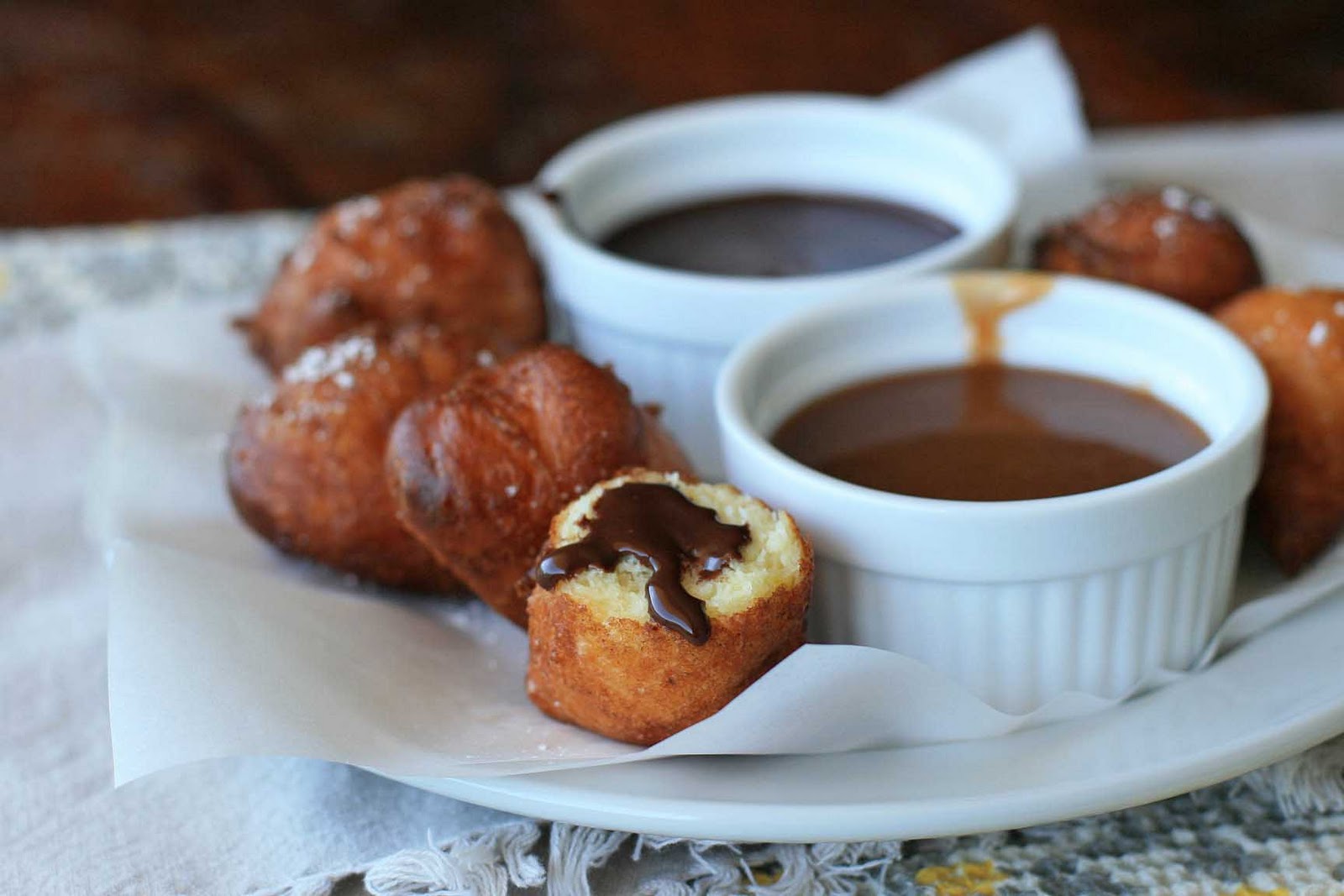 Gluten-Free Mini Ricotta Doughnuts with Bittersweet Chocolate and Salted Caramel Dipping Sauces