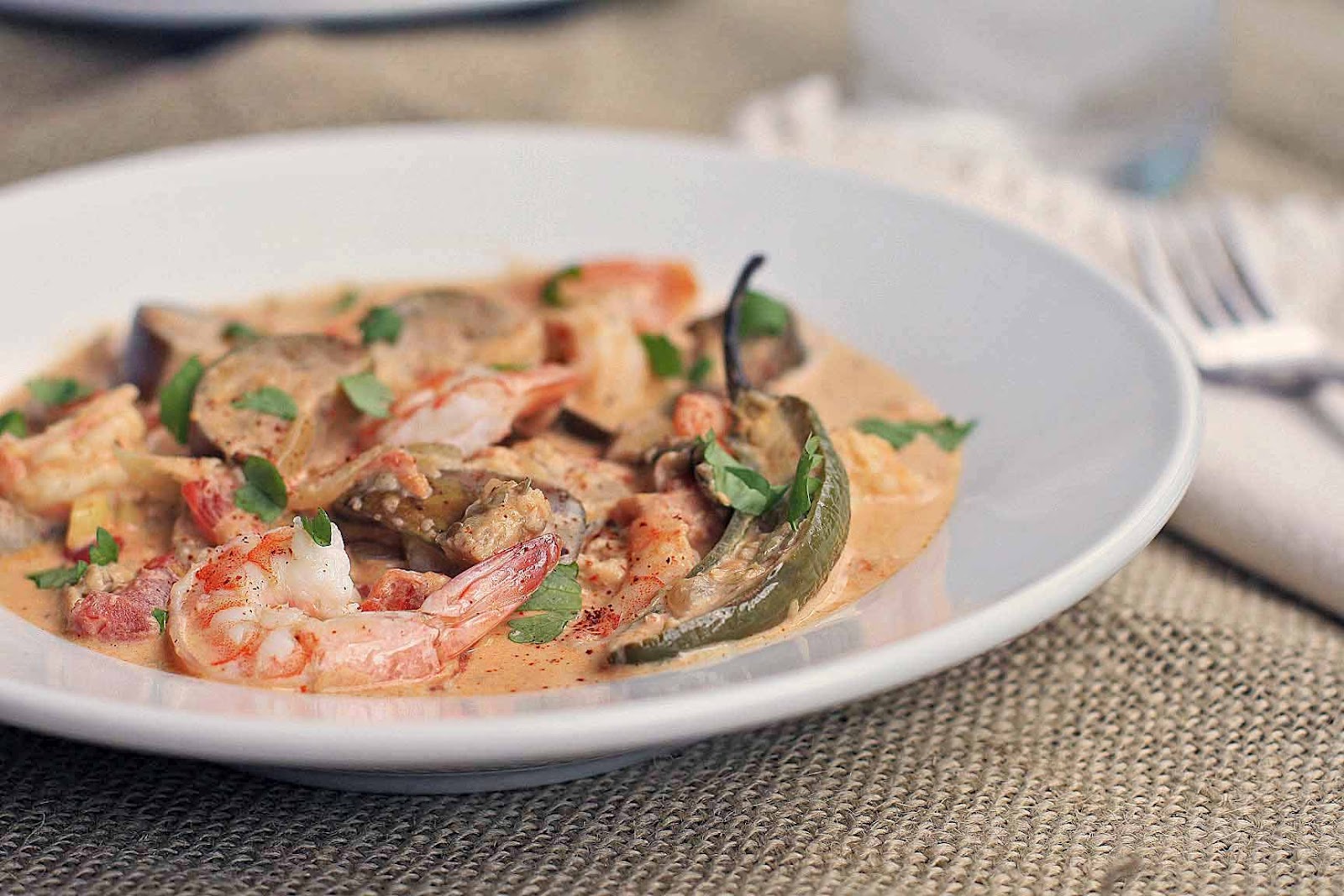 Now is time for the eggplant, chile peppers and salt to get mixed well. Cover and reduce heat to low; cook until the eggplant has softened, about 7-8 minutes. Add the shrimp and cook, stirring, just until the shrimp turns pink. Add the coconut milk and simmer gently until the coconut sauce is hot and the shrimp has cooked through. Remove from heat and stir in the apple cider vinegar. Top with the chopped cilantro and serve atop a bed of rice… brown basmati is a particularly nice match.
