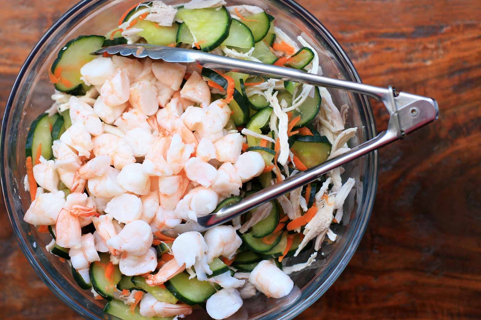 When the pork and chicken are cool enough to handle, use your hands to pull into shreds. Let them cool completely and then add to the cucumber and carrot mixture. Add the shrimp and the toss everything together.