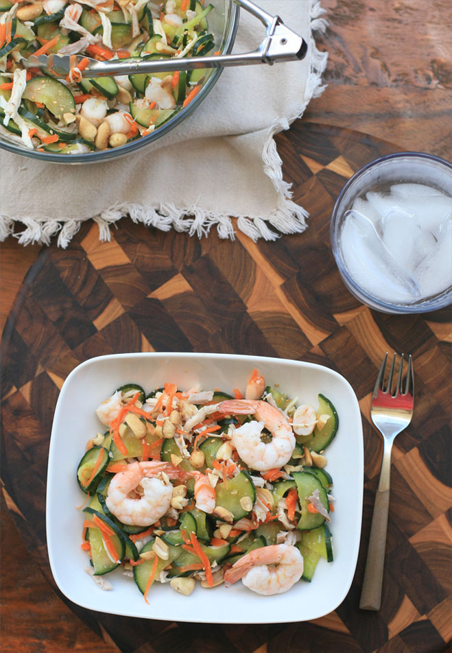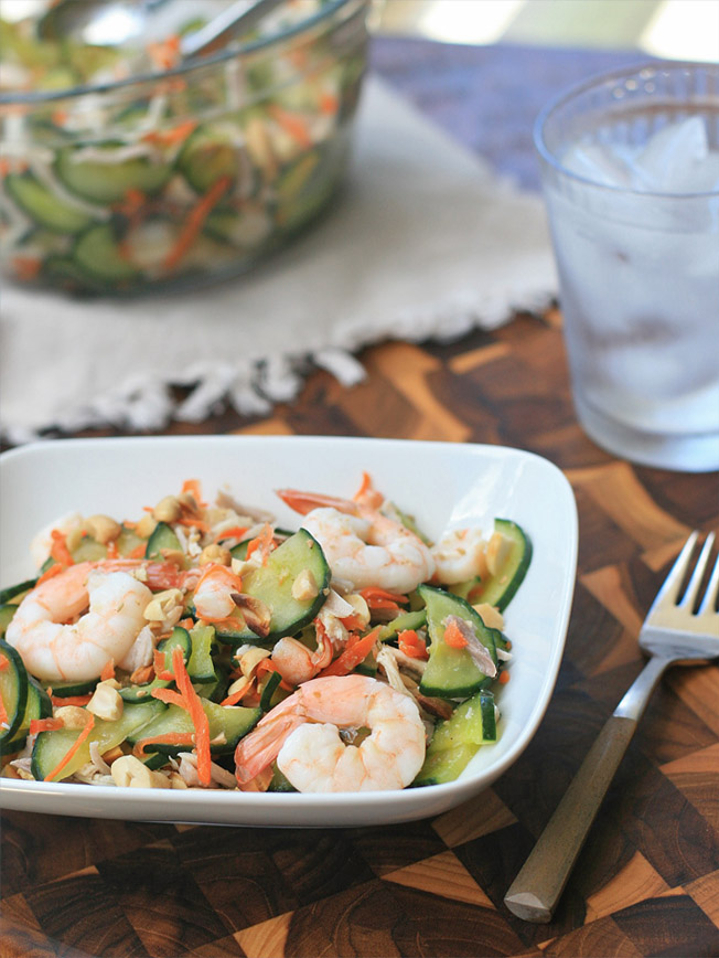 This cucumber and shrimp salad was one of those recipes that I hadn’t seen in any other of my other favorite Vietnamese cookbooks, but since it sounded like a perfect one-dish summer meal, I was eager to give it a shot- even more so after I read Andrea’s headnote that her mother had made it for her wedding reception.