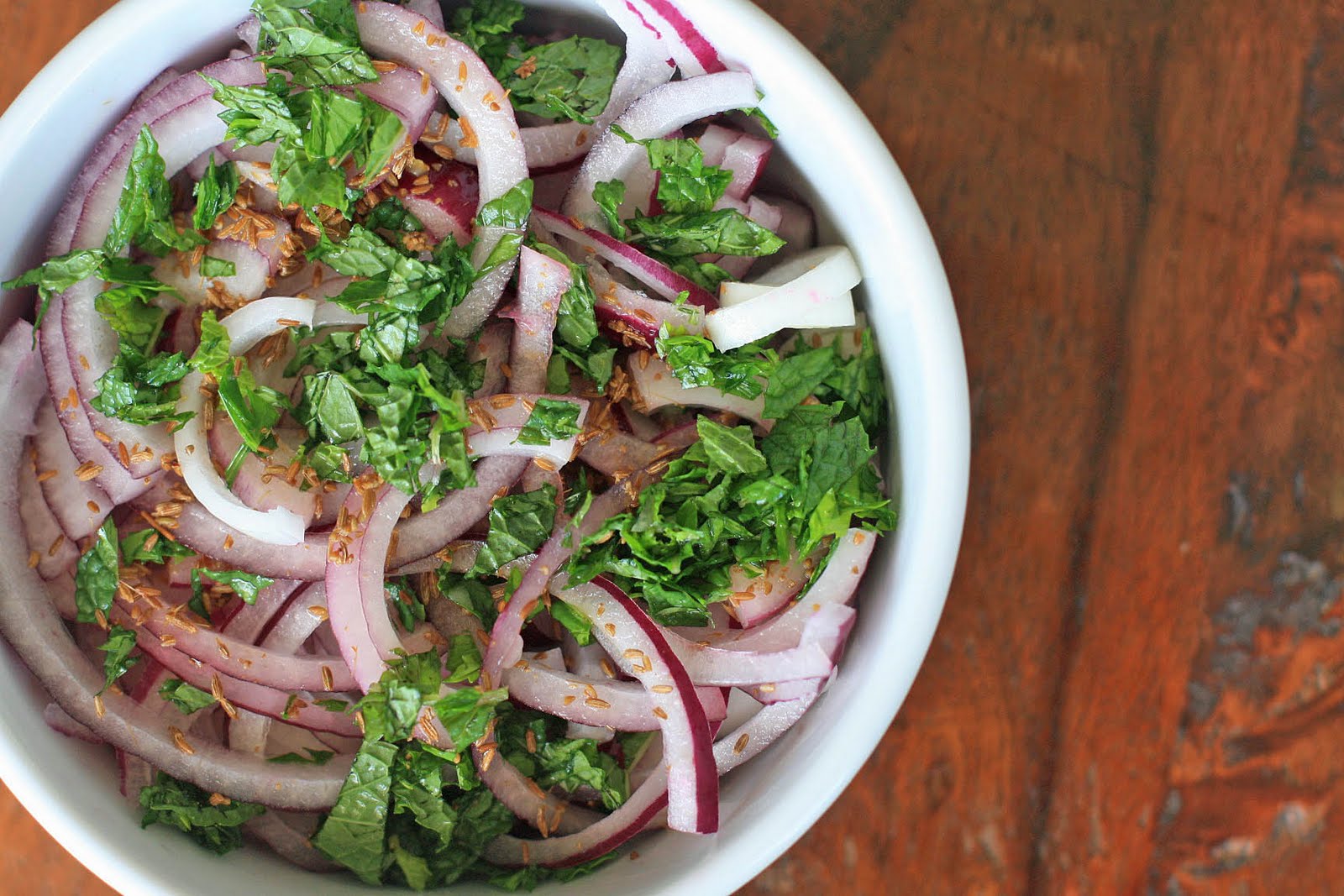Combine the sliced onion, half of the lemon juice, half of the cumin, 1 Tablespoon of the parsley, and the mint and stir to combine.