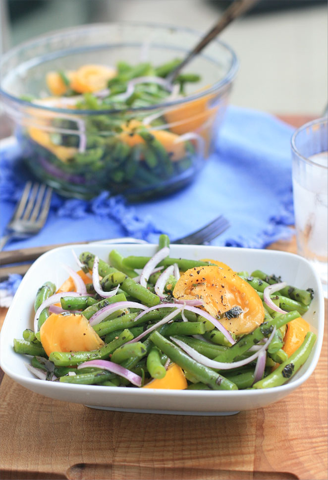 And this is really is a lovely recipe. Warm, tender crisp green beans are combined with a very simple red wine vinaigrette, a sweet heirloom tomato, and a whole lot of chopped mint. A year ago I would have passed this recipe by, but I’m a new fan of mint-infused vegetable salads like this one with kabocha squash (although I often substitute sweet potatoes as well).