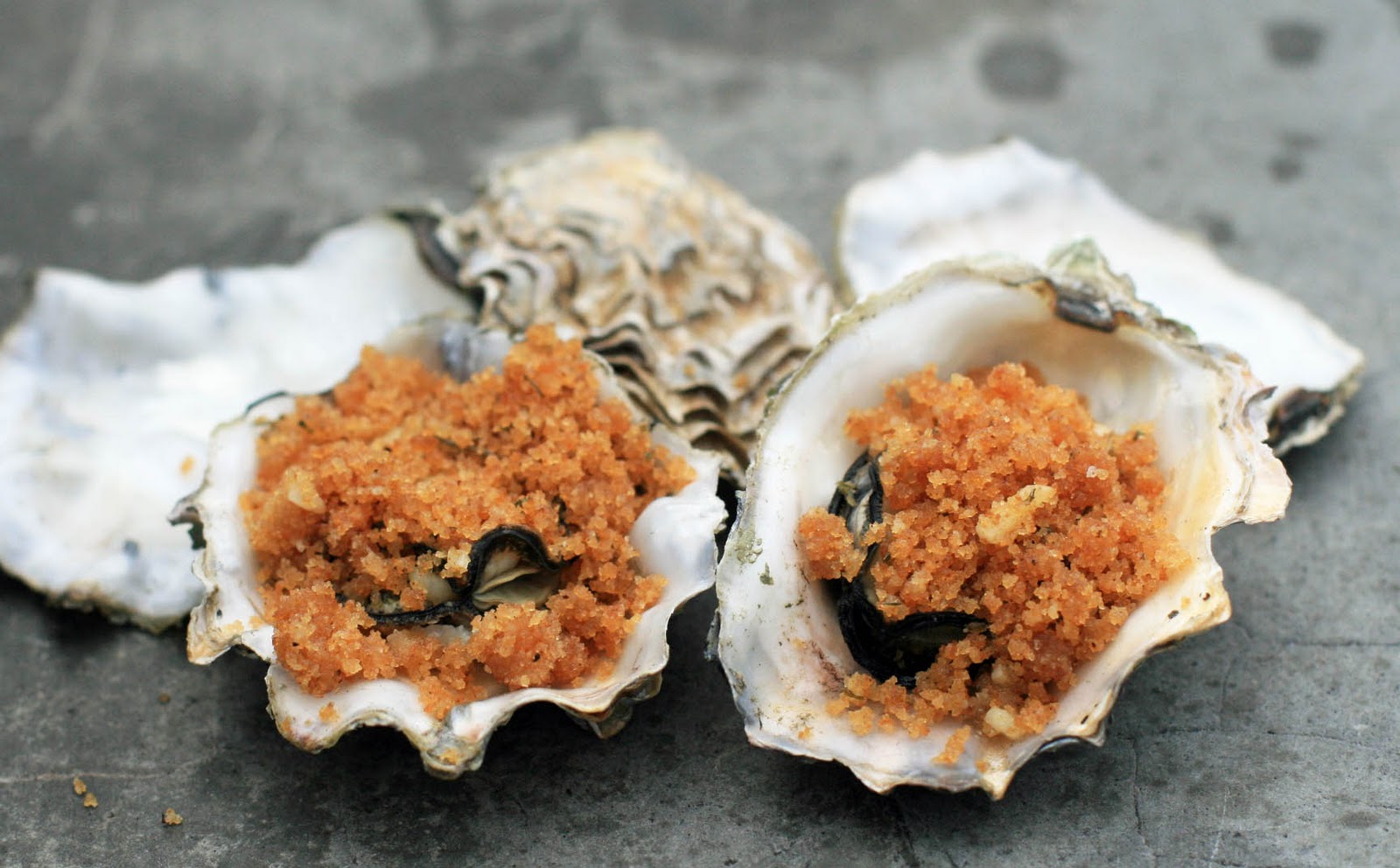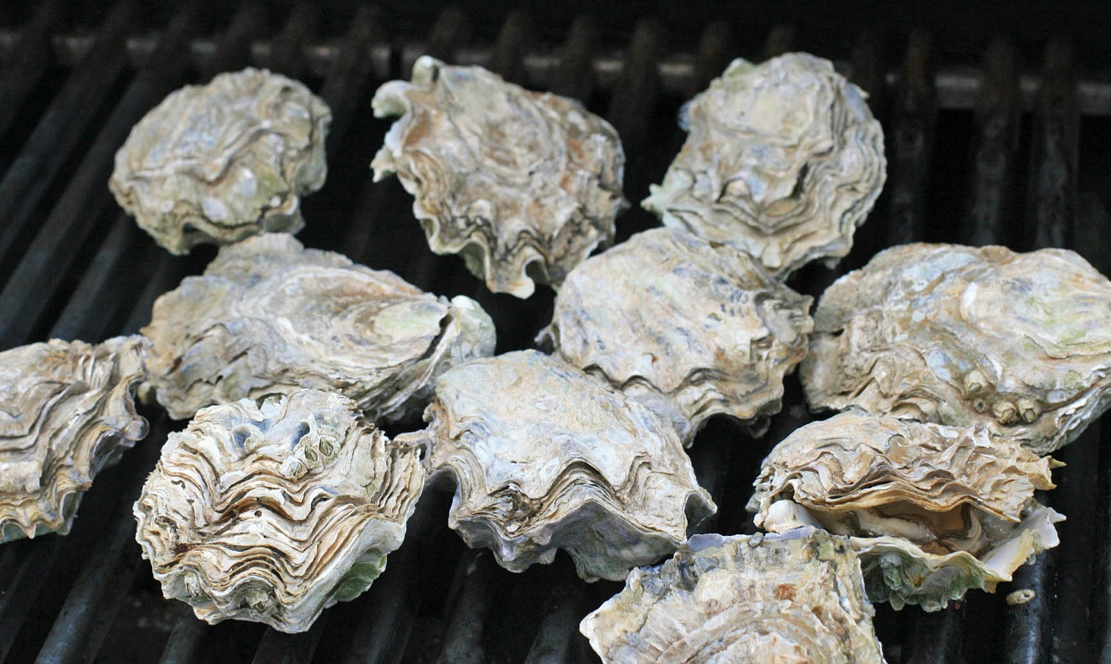 Heat the grill and place oysters on the grill grate so that they’re resting on their deeply curved halves of their shells to ensure that their juices don’t run out.