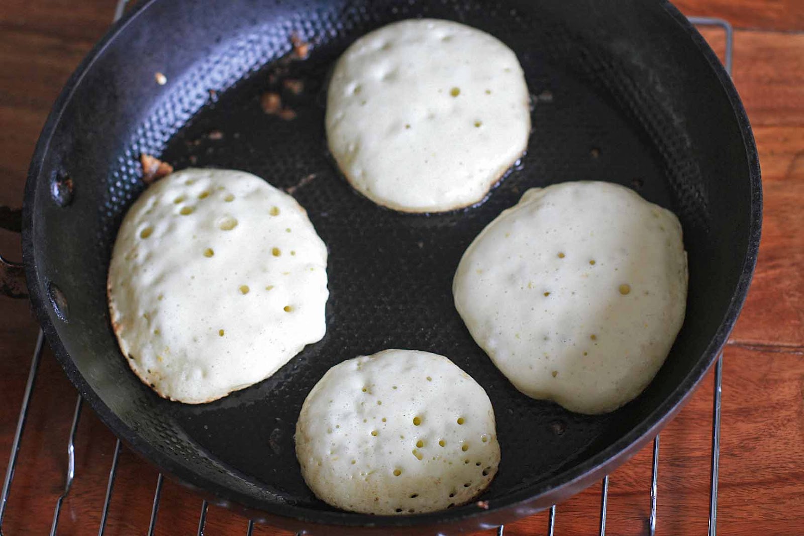 Heat a large frying pan over medium heat. Melt a pat of butter over the surface and ladle the batter onto the pan. Cook until bubbles appear and the edges have dried out a bit. Flip the pancakes over and cook until golden.