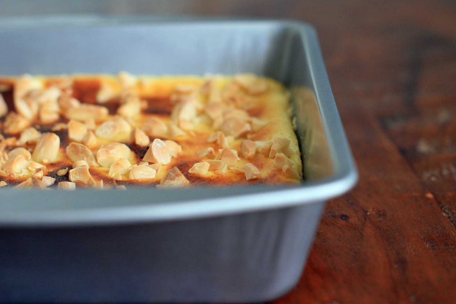 Place the pan in a roasting pan and pour water halfway up the outside of the baking pan. Bake for 20 minutes and then sprinkle with the chopped almonds. Return to oven and continue cooking until the top begins to turn golden, another 20-25 minutes.