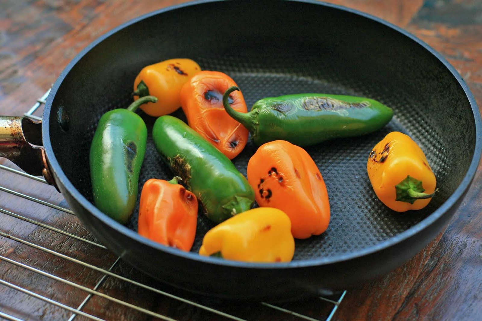 Dry fry the chilies in a frying pan over medium-high heat until the skins begin to scorch. Remove from heat and let sit until they’ve cooled enough to handle. Make a slit lengthwise in the pepper and remove the seeds, keeping the stems intact- I found a really small pair of tongs worked really well for this.