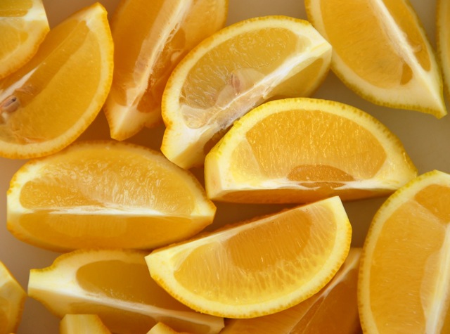 3. Thinly slice off the button end of each lemon. Slice each lemon into quarters. If you are working with very large lemons you may want to cut some of the quarters in half again. Remove seeds.