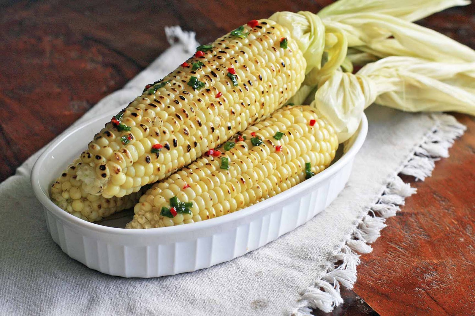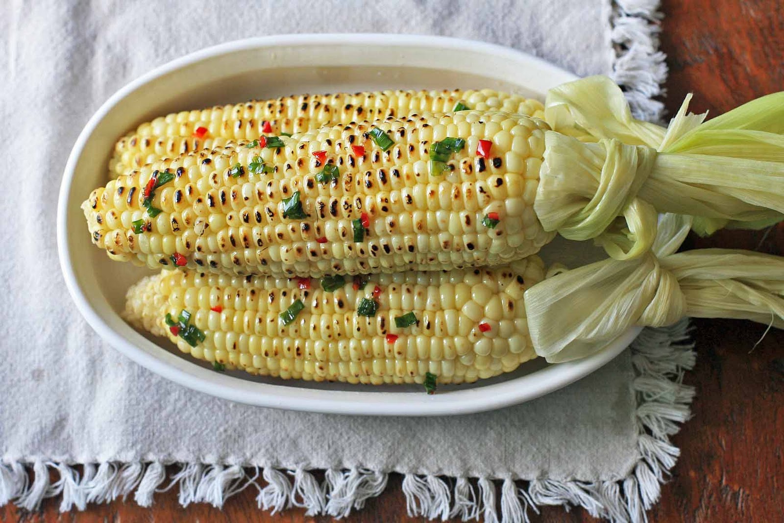 Over an open gas-stove flame char one of the ears of corn, rotating it every so often until slightly blackened on all sides. Remove to a serving platter and repeat with the remaining ears of corn.