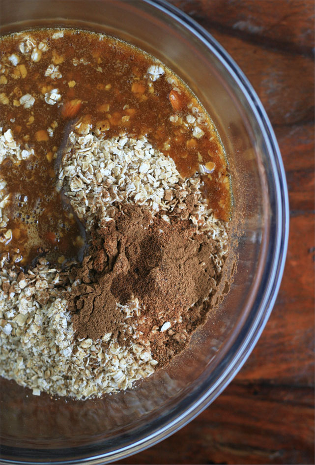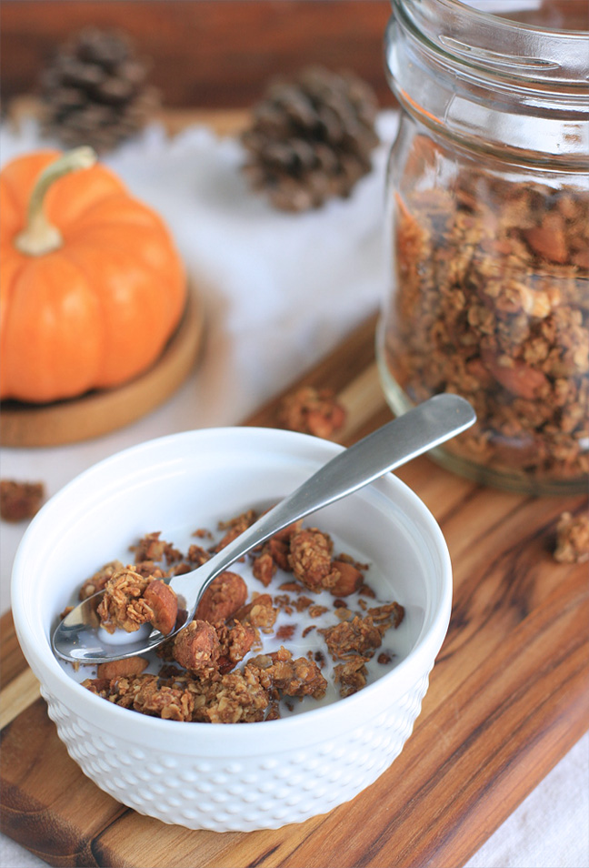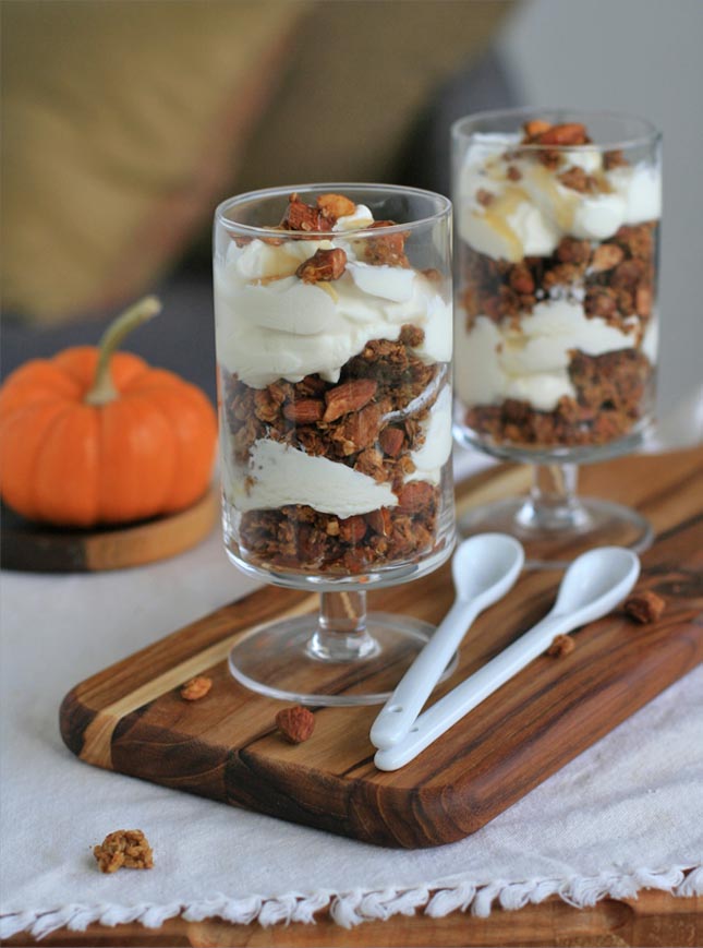 I used almonds because that’s what I had on hand, but pecans would also be great. And I like my pumpkin spice granola free from dried fruits, but dried cranberries would work well here, and provide a little burst of color.