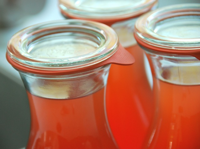 Note: when hot water bath preserving rhubeena, the headspace should be 1/2 inch. Don’t be fooled by the little bubbles that are on top when you place the hot liquid into jars, as apparently I was.