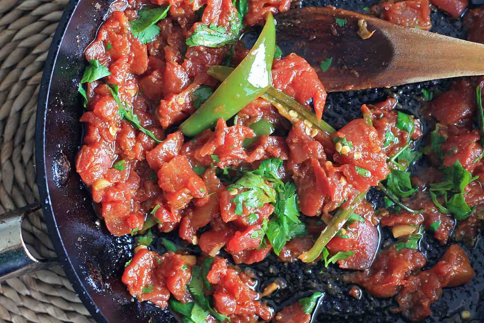 Reduce the heat to medium-low and add the tomatoes and all of the juice from the can, chile pepper, and cayenne. Simmer until the tomatoes are cooked and use the back of a wooden spoon to mash the tomatoes to break them down into a chunky sauce. Add the cilantro and cook for another minute. Season with salt and pepper to taste.