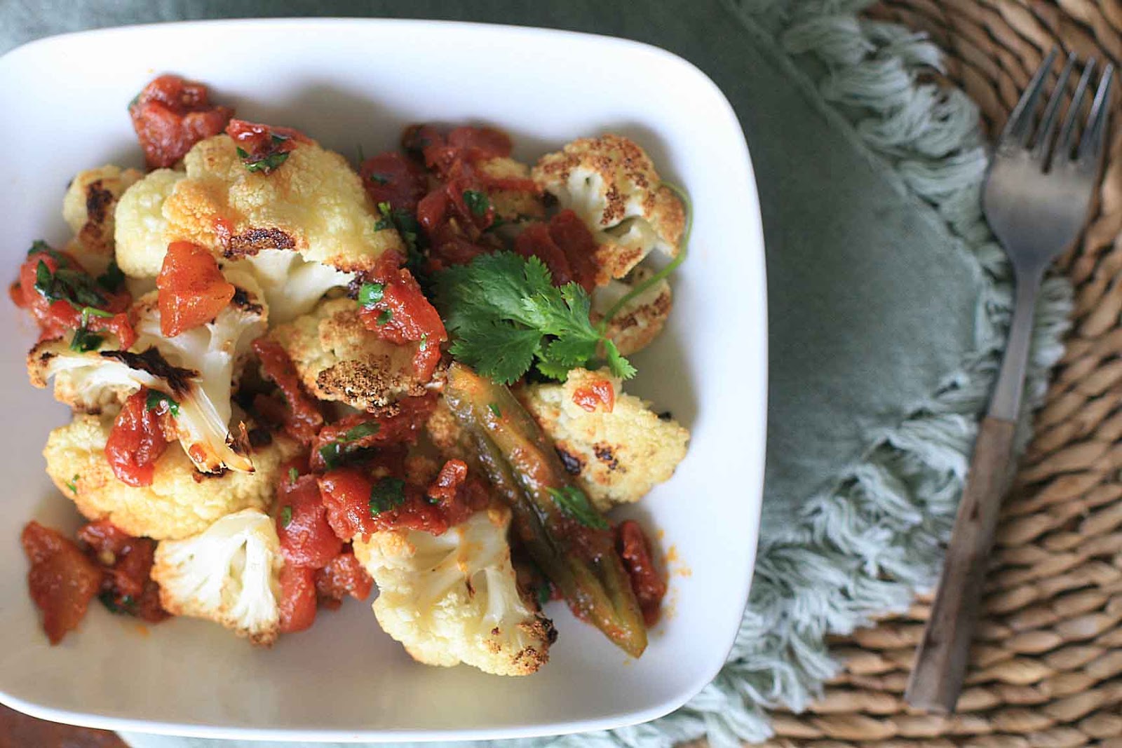 And while I still prefer most other roasted vegetables in their naked state, roasted cauliflower turns into quite the showstopper when topped with a bright, Indian tomato sauce. It’s a colorful, healthy and unique dish that is simple to make but packs a spicy punch.