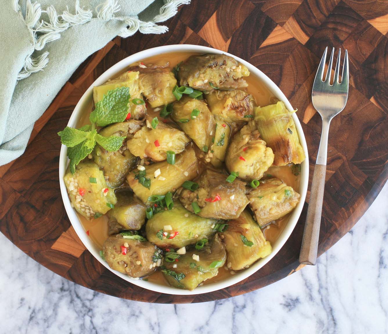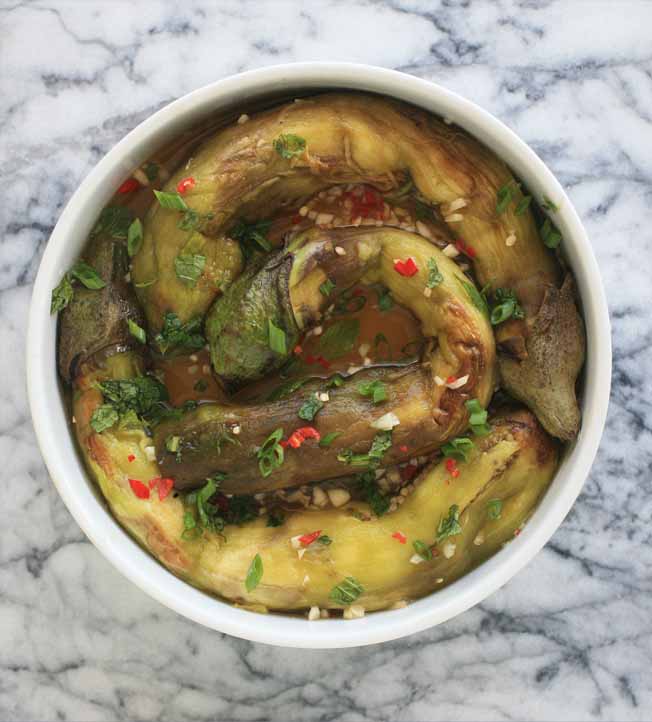 In this Vietnamese dish, Asian eggplants are roasted over an open flame and then tossed with the miracle fish sauce dressing and scattered with some fresh mint and green onion.