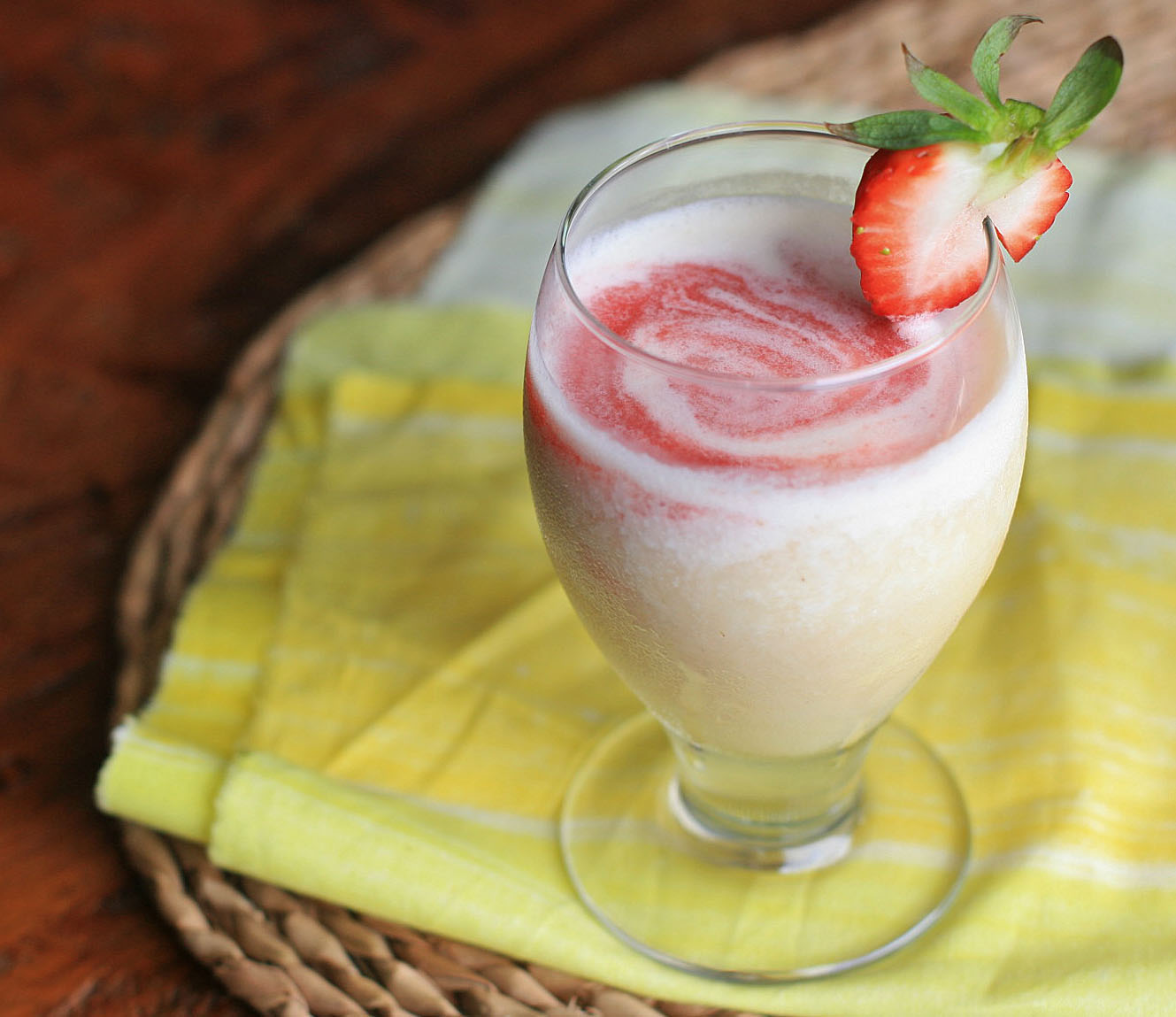 Combine the rum, banana, cream of coconut, lime juice and ice in a blender and process until smooth. Pour into one or two glasses and then top with strawberry puree. Use a straw to swirl the strawberry puree through the drink. Serve immediately.