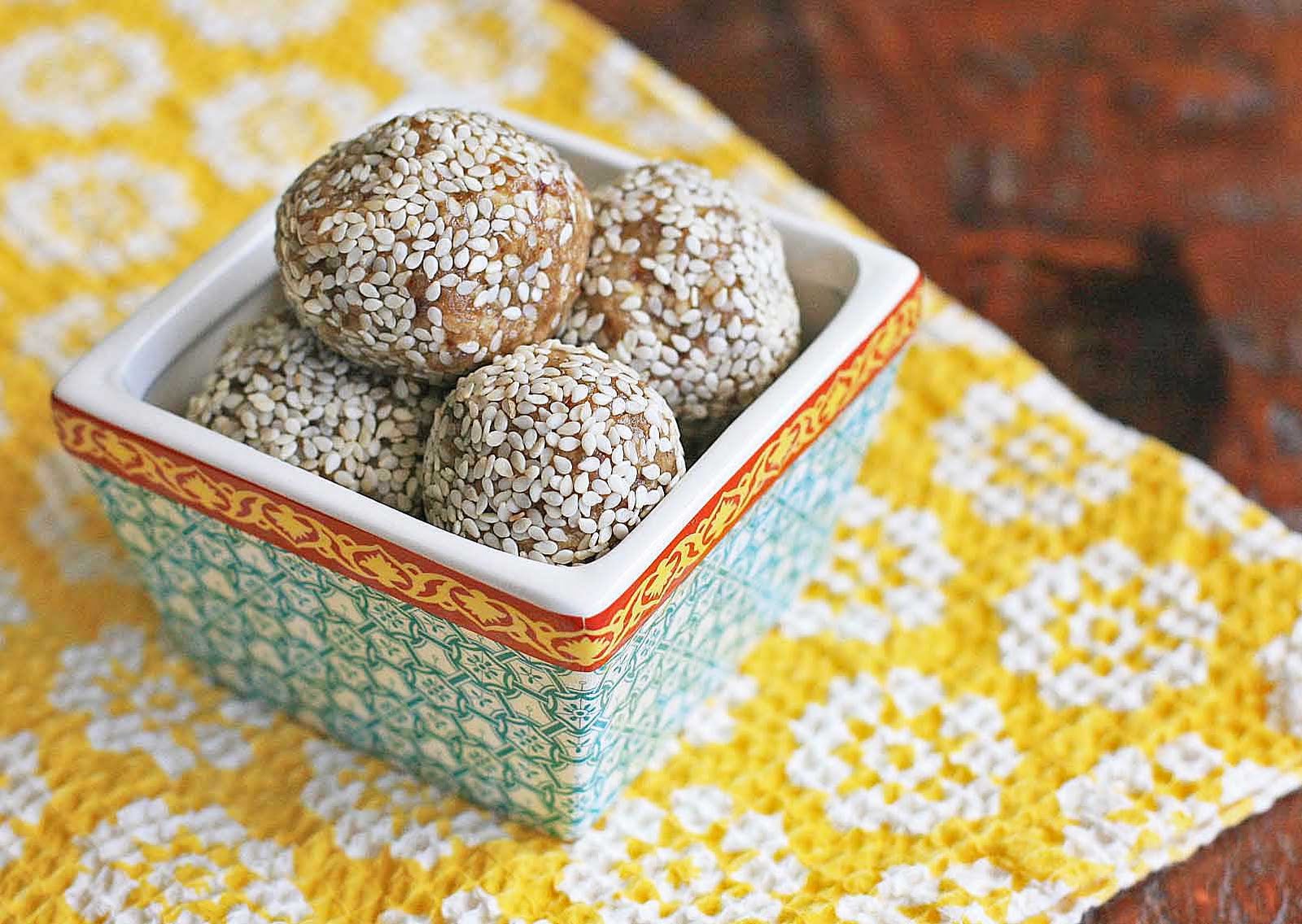 Let cool slightly. Roll the mixture into about a dozen small balls. Roll each ball in the sesame seeds to coat.