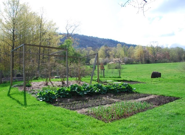 The garlic is popping; the rhubarb…forgettaboutit! The blueberry frame’s shoulder is broken. The wicked winter brought it down. The onions are planted; the squash bed is ready. The grass is a cow’s green dream!