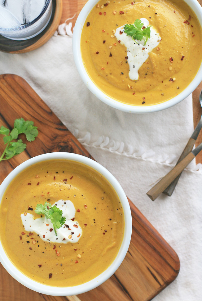 Ladle into individual bowls, top with coconut cream, crème fraiche or sour cream, some cilantro, a sprinkle of black pepper and a small shake of crushed red pepper flakes, if desired.